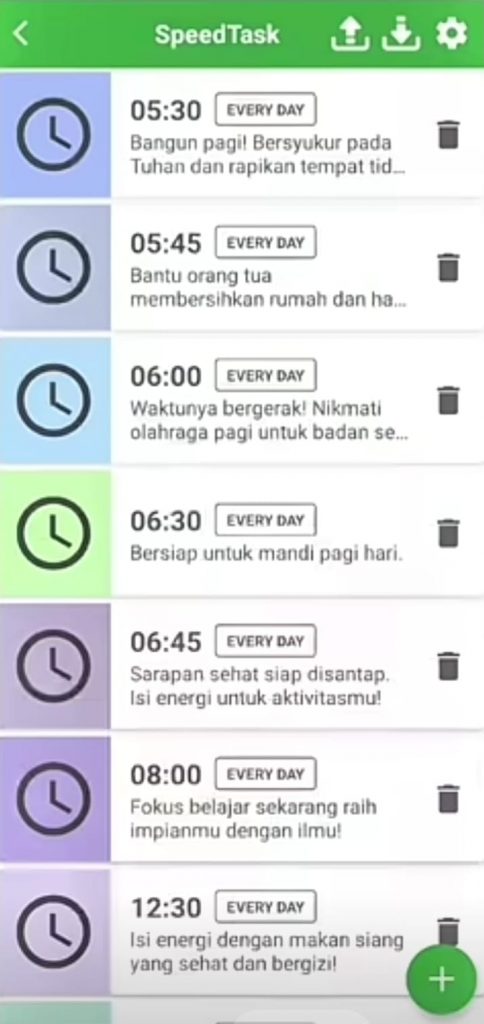 Setiap siswa akan mengikuti 7 kebiasaan harian yang dikemas dalam aplikasi digital berbasis SpeedTask, mulai dari bangun tidur hingga tidur malam, lengkap dengan reminder bersuara di smartphone yang membantu membentuk rutinitas disiplin dan tanggung jawab.